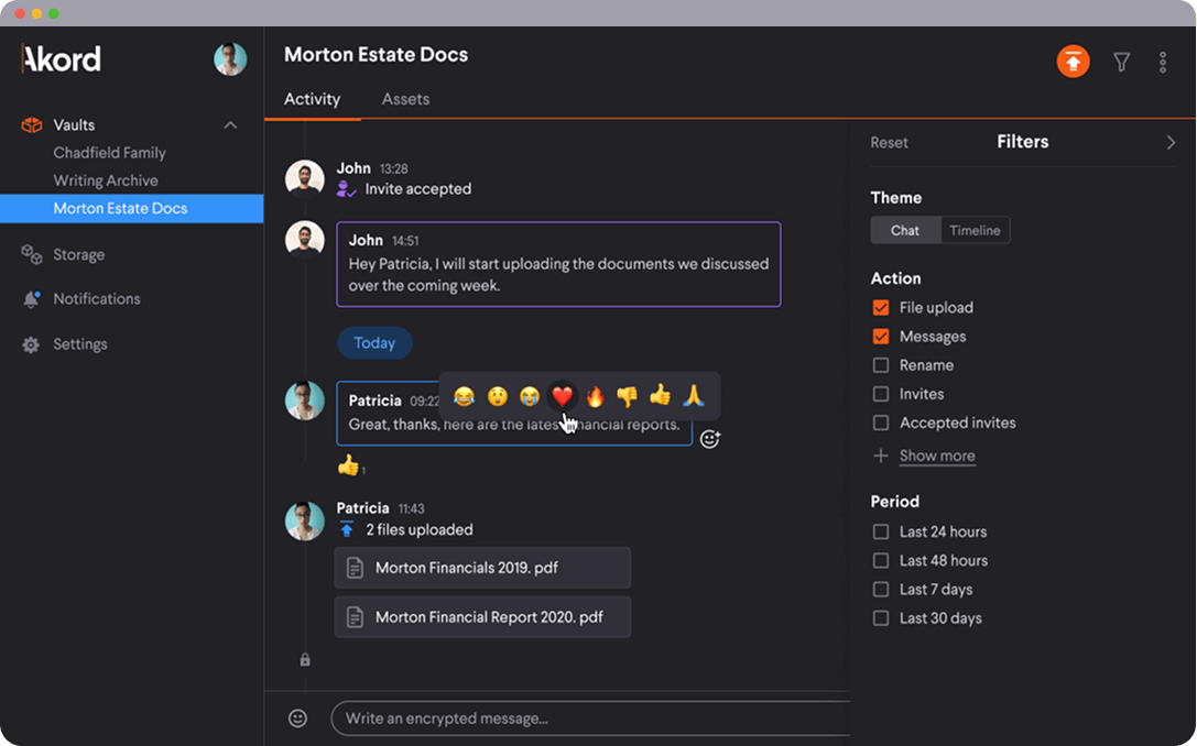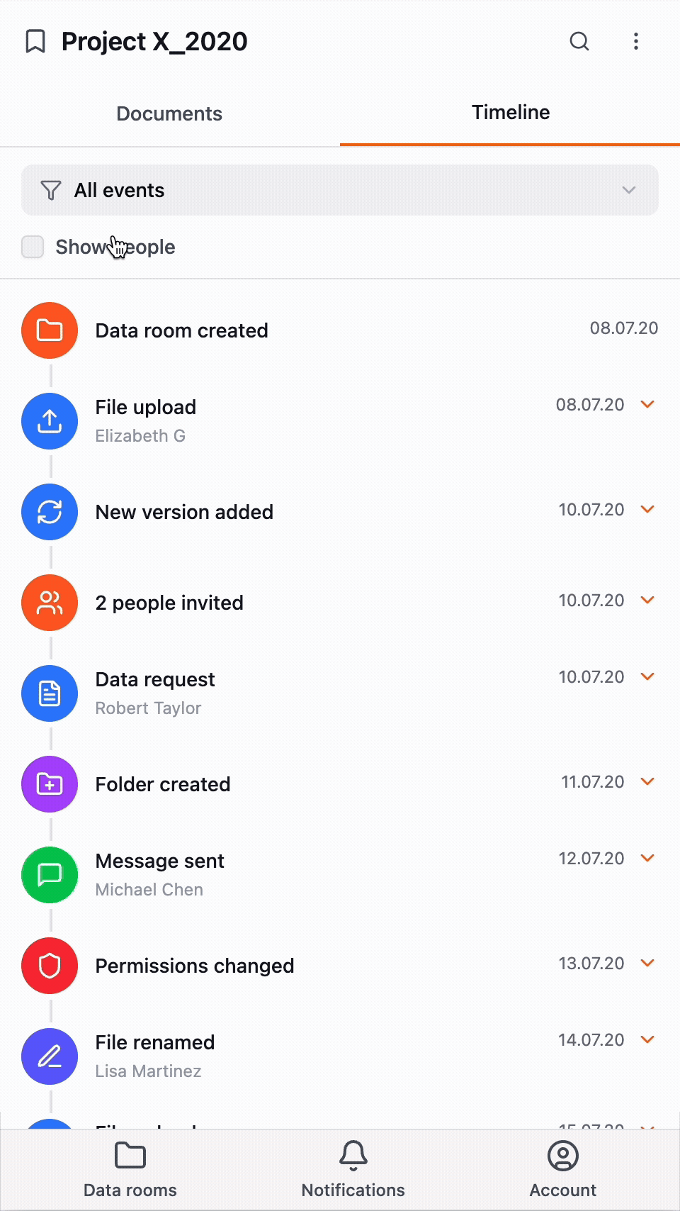 Early feedback confirmed our intuition that business would value secure collaboration and privacy more than individuals. The user experience grew around the idea of a data room where every action – file upload, folder rename, message – would be private and immutably recorded in an auditable ledger of events.