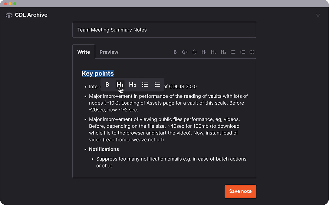 The Akord platform focused on easy onboarding, users with any level of technical knowledge store data on Arweave. Along with a complete file management system, we built in essential collaboration, team and org features like access control, notifications, private messaging, and white labelling for enterprise customers.